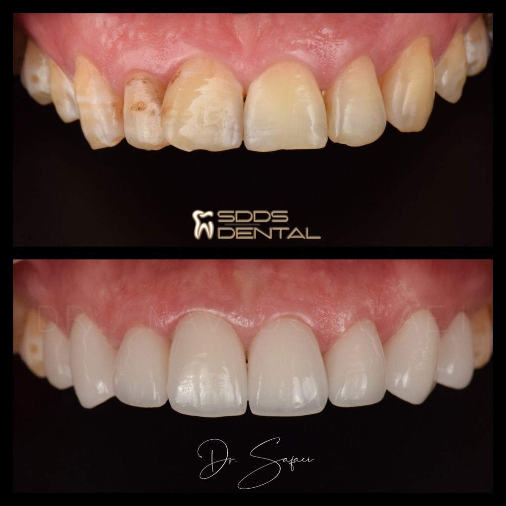 Since veneers are uniquely shaped for each patient, it is nearly impossible to tell the difference between a veneer and a natural tooth. One benefit of veneers, due to their high-tech materials, is their ability to resist stains caused by coffee and tea, as well as stains caused by cigarette smoke. If you have dark or discolored teeth, veneers will give you a beautiful bright white smile. Dr. Safaei may also recommend veneers to fix spacing or gaps, and overlapping teeth.